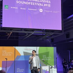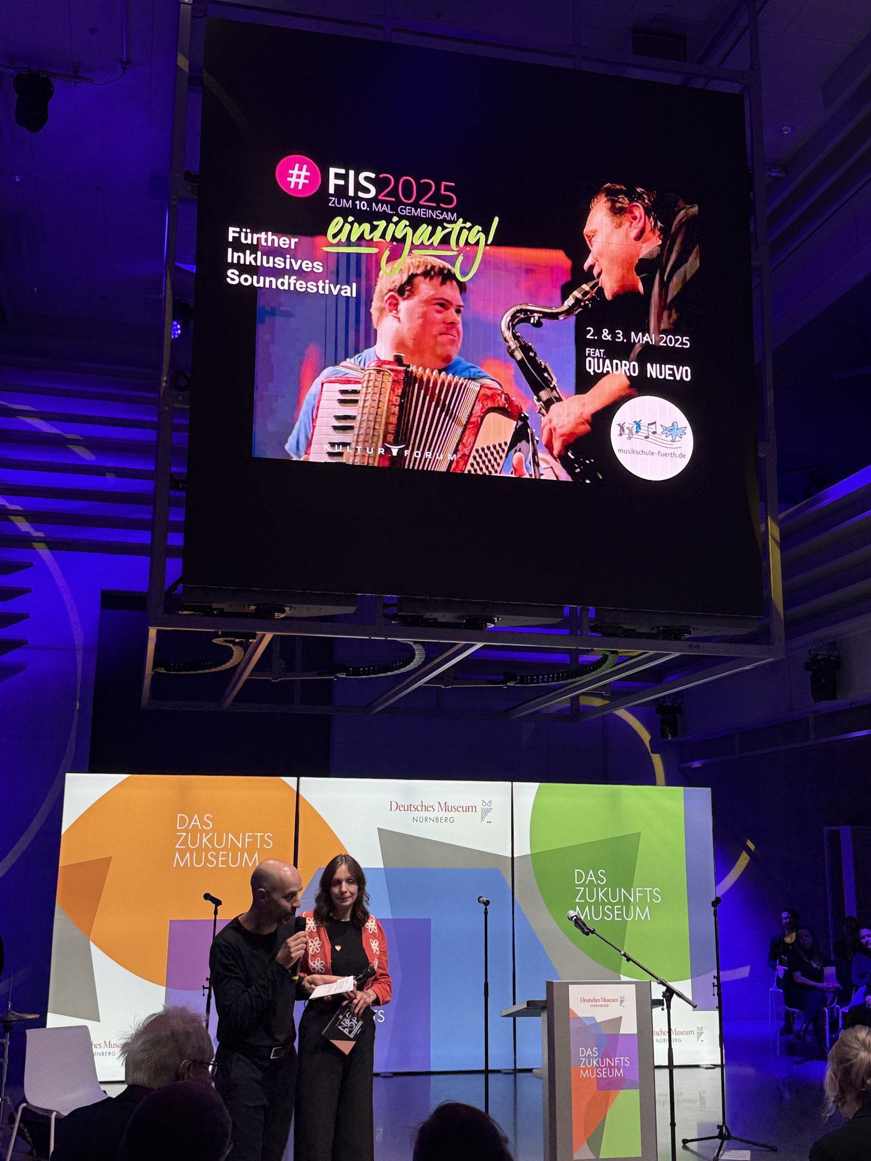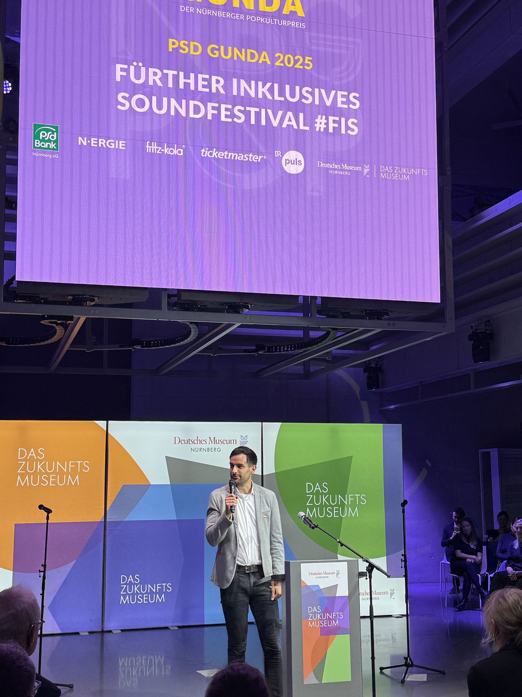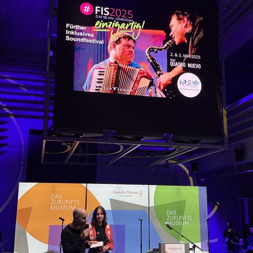 Carolin Heuser wies in ihrer Dankesrede darauf hin, wie stolz und glücklich es uns macht, dass die Vision eines Festivals Realität wurde, in dessen Rahmen Menschen mit Behinderung die Qualität ihrer Kunst unter professionellen Bedingungen präsentieren können. Der heutige Abend, an dem das Fürther Inklusive Soundfestival der Musikschule Fürth mit anderen namhaften Festivals wie dem Brückenfestival und dem Nürnberg Pop Festival in einem Atemzug genannt wird, beweise eindrücklich, dass diese Idee aufgegangen sei.